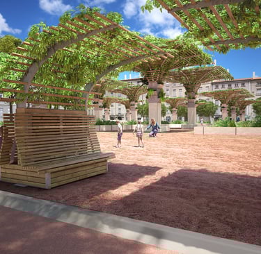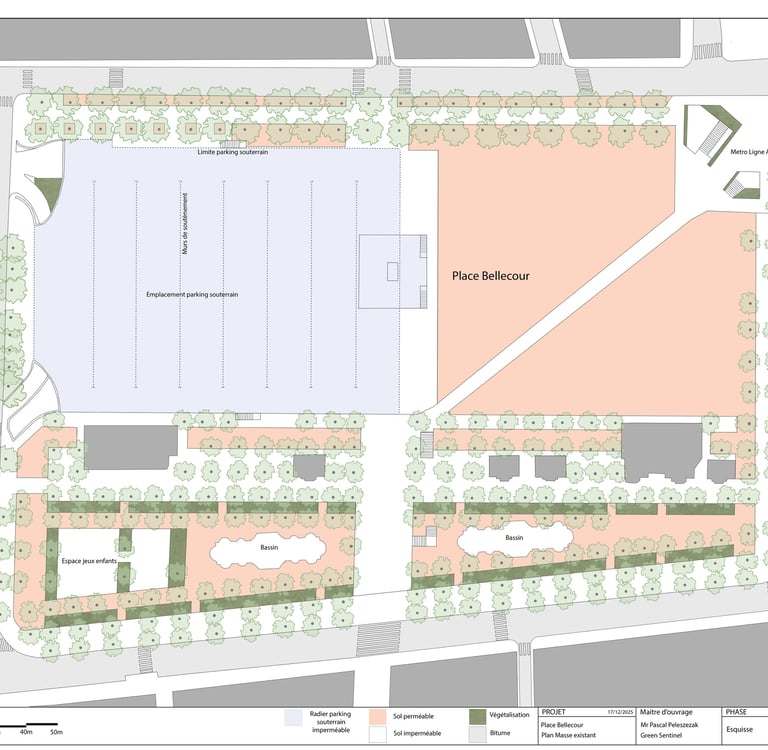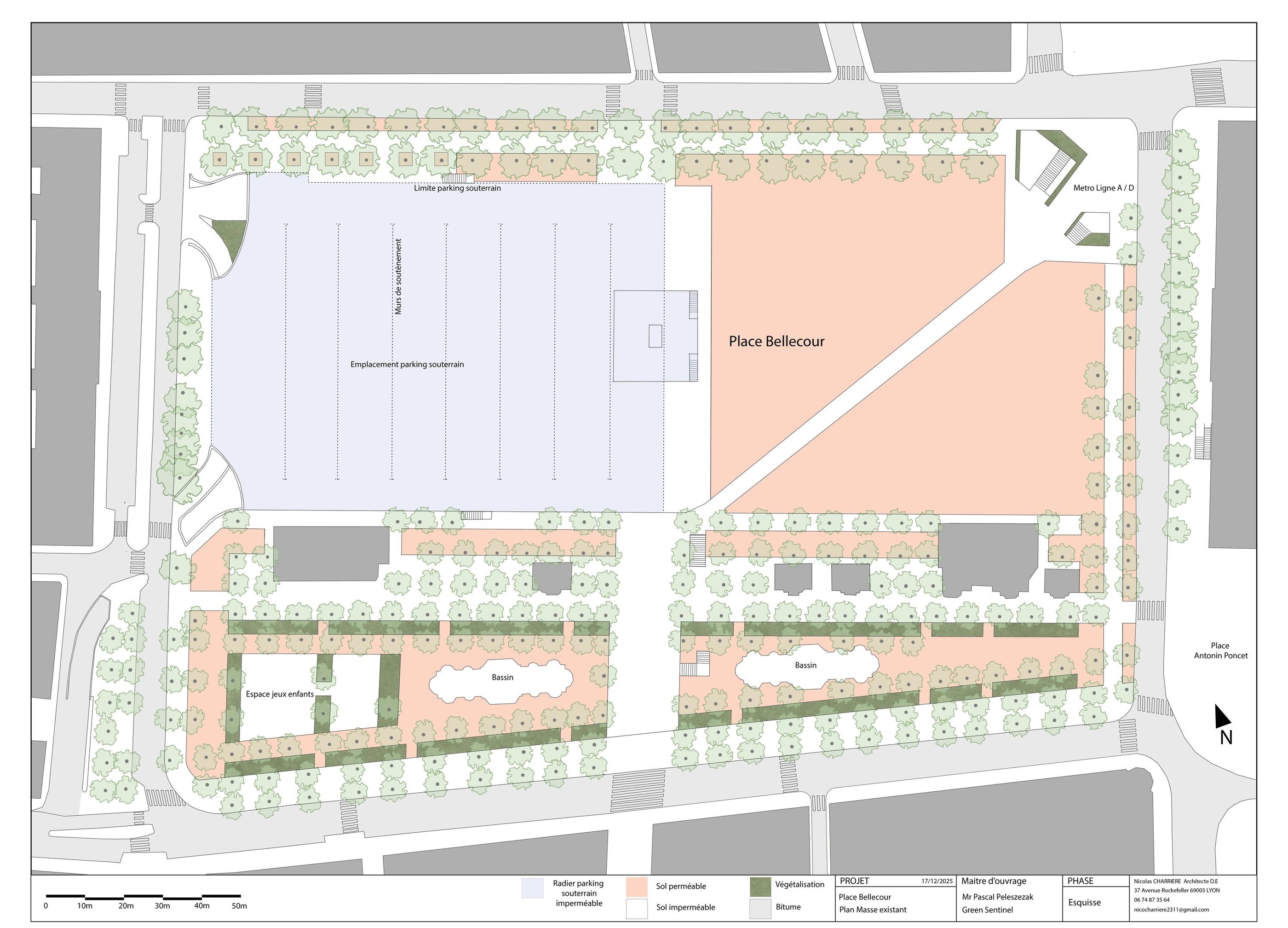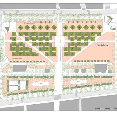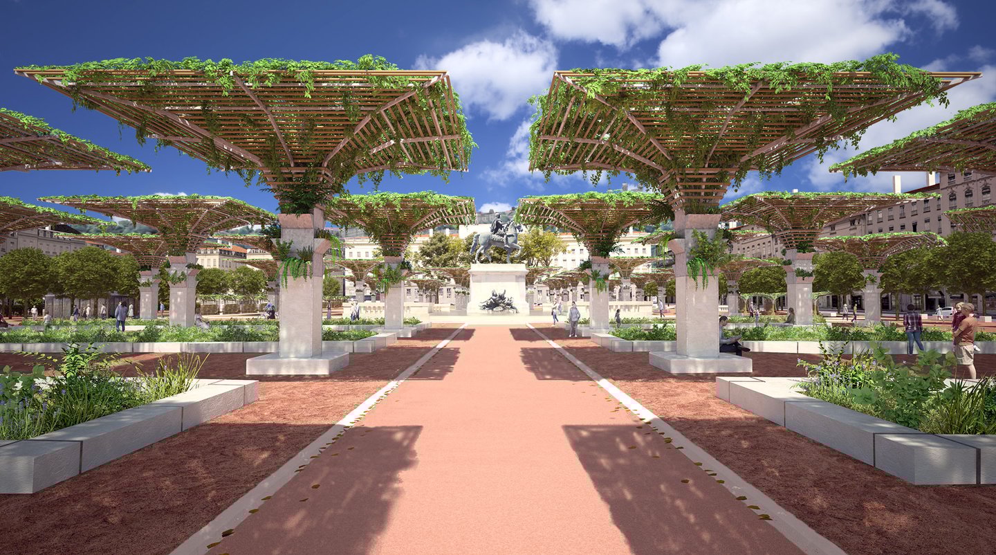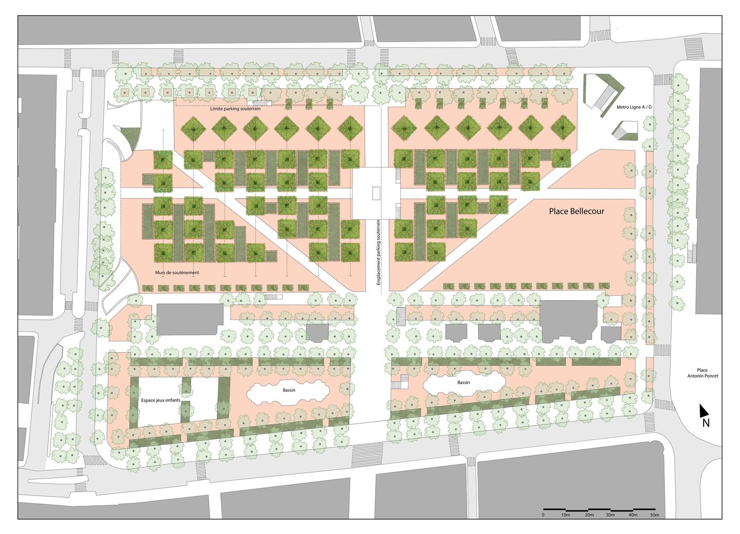 La présence du parking souterrain rendait impossible la création d’un dispositif de type coulée verte ou encore la transformation en parc d’agrément. Cette problématique a paradoxalement permis de protéger le site comme place urbaine et ainsi a permis de ne pas le dénaturer en voulant le transformer en jardin. Cet espace nu de couleur rouge orangé donne la caractéristique la plus reconnaissable de la place Bellecour. Le dispositif de végétalisation organisée autour des canopées permet de déployer des jardins suspendus à même de créer de nouveaux usages pour cette place iconique.