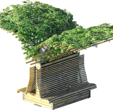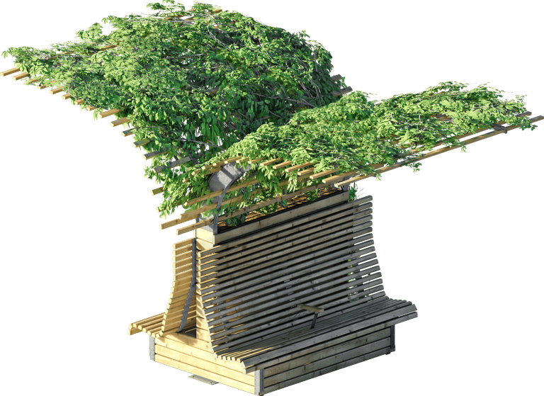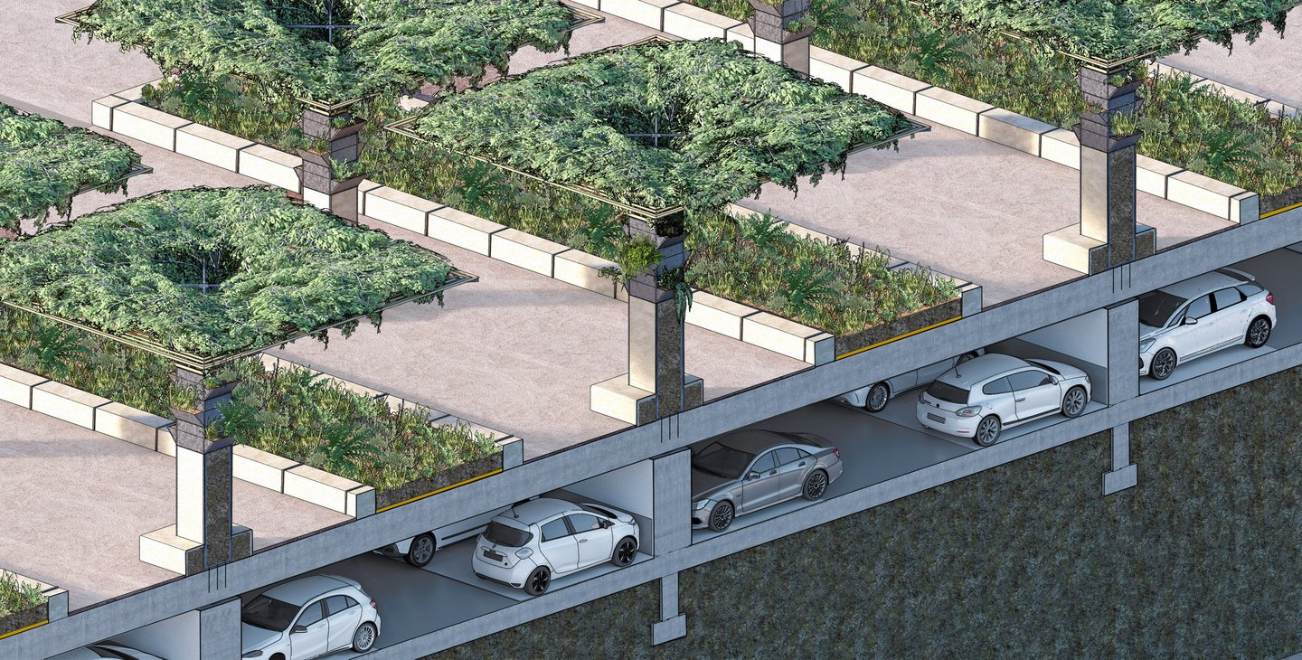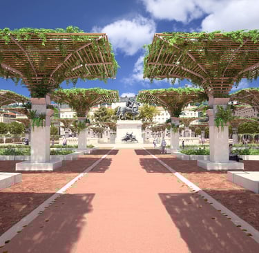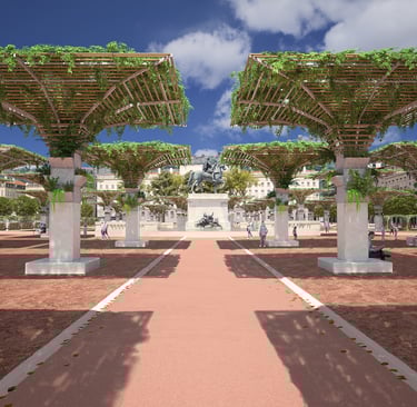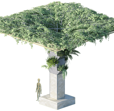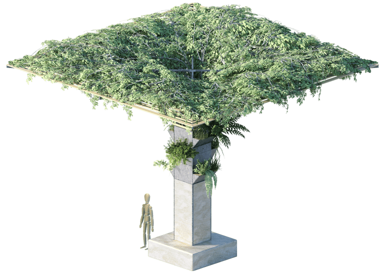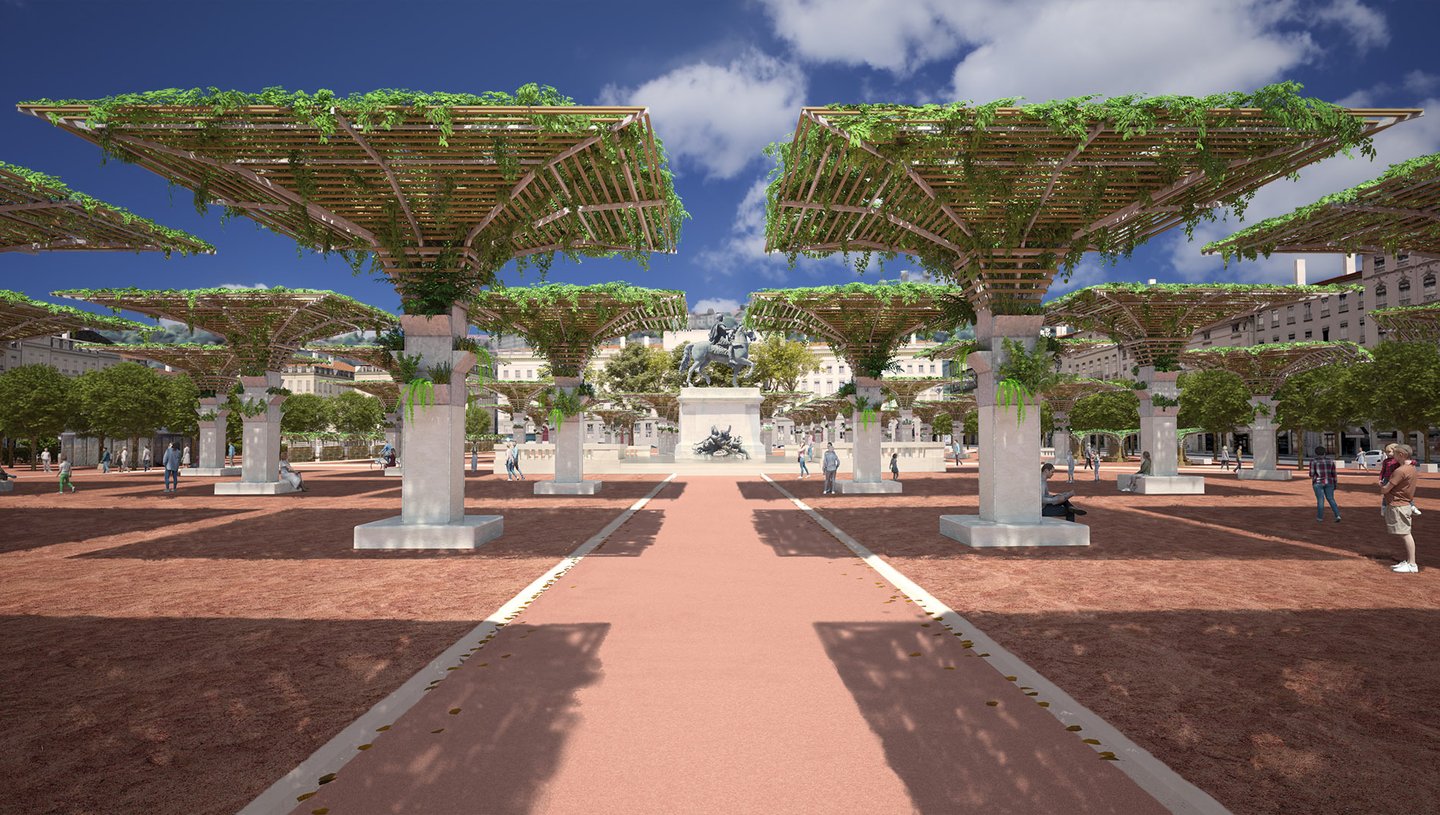 La difficulté technique est de proposer une végétalisation sans pouvoir planter d’arbres. En effet la moitié Saône de la place Bellecour est occupée par un parking souterrain. Celui-ci est peu enterré, ainsi le radier formant le toit de celui-ci correspond à la surface de la place elle-même. La solution consiste à utiliser les murs porteurs du parking lui-même afin de faire reposer à la verticale de ceux-ci les ombrières. Il s’agit ici de créer des ombrières à même de créer suffisamment de confort pour pouvoir rendre cet immense espace minéral agréable même sous des températures estivales, c’est ce qui détermine la création d’ombrières végétaliser. La végétation générant de l’ombre et de l’humidité, sans dispositif technique complexe et fragile, le tout de façon résiliente et pérenne. Le dispositif architectural ainsi déployé doit respecter l’échelle du site, les ombrières forment d’imposantes canopées végétales de 6,50 m de haut pour 8,50 m de diamètre. Elles sont de forme carrée afin de ne pas proposer une imitation maladroite du vivant, mais plutôt de rester dans une modélisation respectueuse de cette pensée rationnelle ayant donné la forme que nous connaissons à la place Bellecour. La hauteur confortable de ces jardins suspendus permet au regard d’embrasser l’intégralité du site. Le dispositif permet par conséquent de ne pas dénaturer les qualités optiques et spatiales de cet endroit prestigieux. Enfin le dispositif peut être agrémenté de grandes jardinières venant se glisser entre les canopées afin de proposer une végétalisation au niveau du sol et ainsi définir une véritable promenade architecturale.