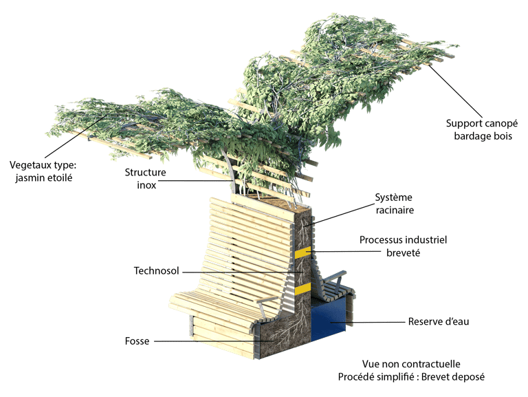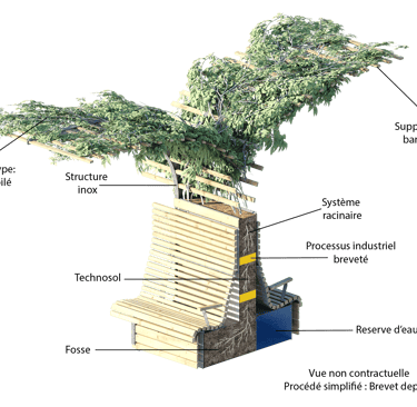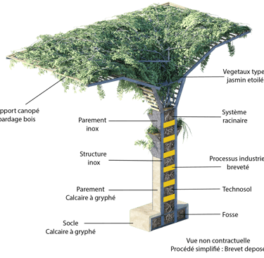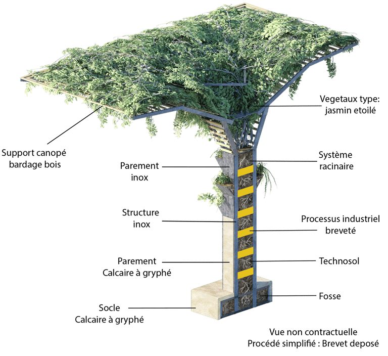 La matérialité des canopées végétales se doit également de respecter le site. Le socle et la base du tronc sont constitués des mêmes pierres employées pour la construction des immeubles cernant la place c’est-à-dire des pierres de Lucenay appelé également calcaire à gryphées. La partie supérieure du tronc dispose de bacs en inox, qui dans leur matérialité même propose une lisibilité de la réalité structurelle de l’ouvrage. Celui-ci est en effet creux et organisé sur une structure en inox. Ce type de construction légère et solide permet de déployer dans sa base une réserve d’eau et dans son tronc une verticalisation du sol. Le sommet est organisé autour des structures porteuses en inox et des lambris en bois supportant la végétation. Ces trois types de matériaux expriment les trois axes de la pensée architectonique organisant la réalisation de ces canopées. La base est en pierre comme le site l’impose, la partie supérieure métallique donne à voir la réalité technique et contemporaine de l’ouvrage. Et enfin la partie au sommet est au contact du végétal, donc elle reprend le bois comme lien entre le vivant et l’inerte.